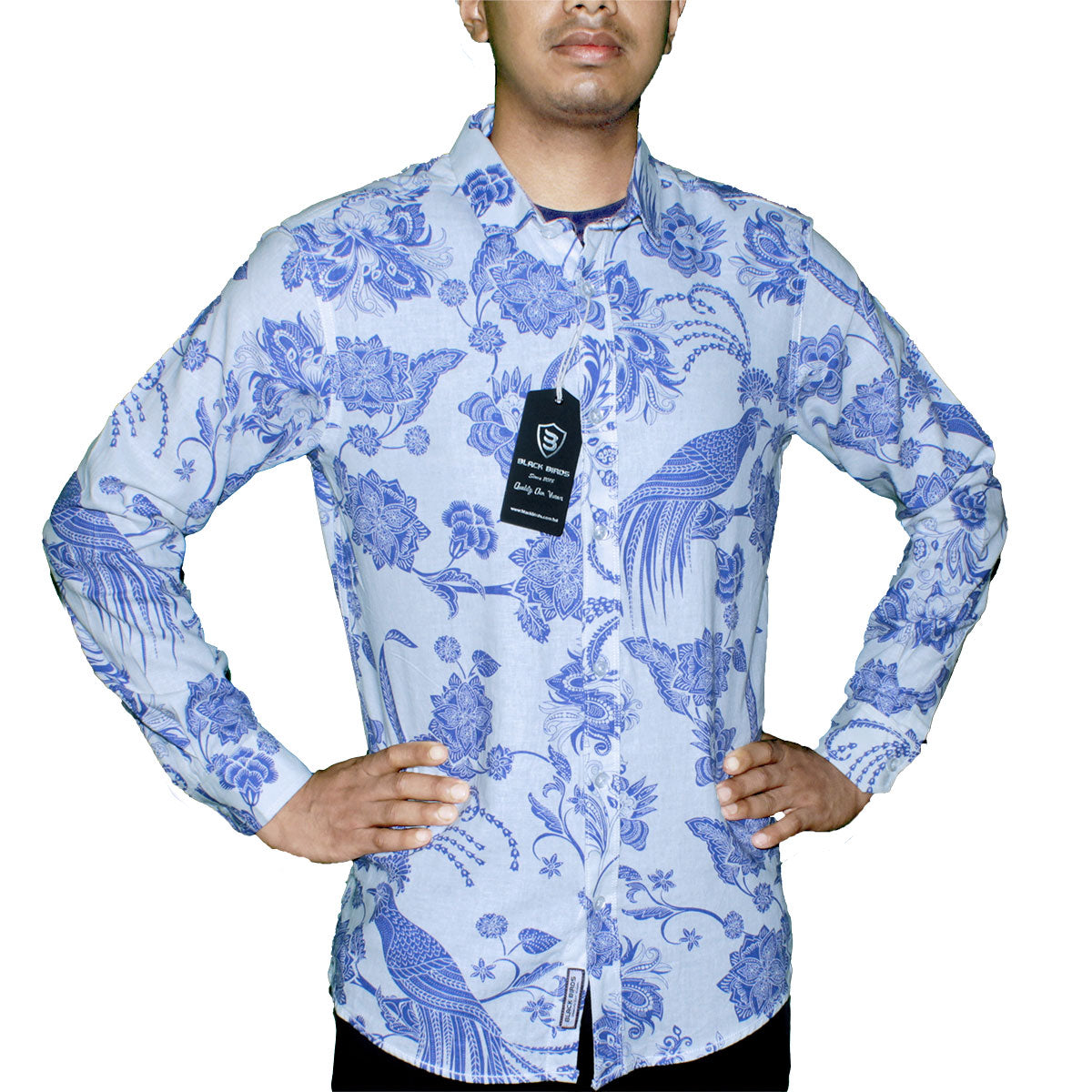 A stylish blue floral patterned shirt perfect for casual or semi-formal occasions. Made from high-quality fabric, this long-sleeve shirt offers comfort and elegance. Features a unique bird and flower design, making it a great choice for both day and night wear